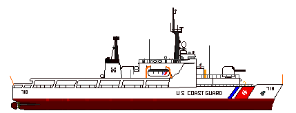 | The high endurance cutter Hamiliton was built in 1965 and was the first of the "Hamiliton" or "Hero" class, named after Coast Guard heros and earlier cutters of the same name. The Hamiliton was named for the cutter Alexander Hamiliton which was built in 1936 and was sunk during World War II. The Hamiliton is shown prior to her refit which is displayed by the cutter Chase in the above graphic. She is homeported in San Pedro, CA. |